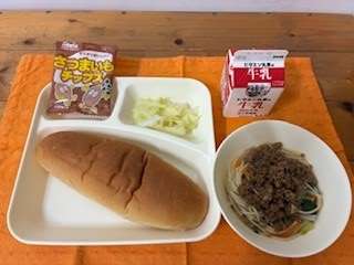 タンタンめん、キャベツの甘酢づけ、おさつチップス、黒糖パン、牛乳