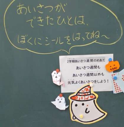 元気よくあいさつができたという人は、各教室に配られたハロウィンの台紙に、シールを貼っています。