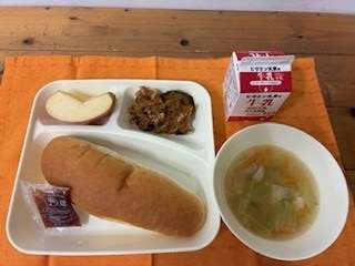 なすのミートグラタン、鶏肉とキャベツのスープ、りんご、コッペパン(いちごジャム)、牛乳