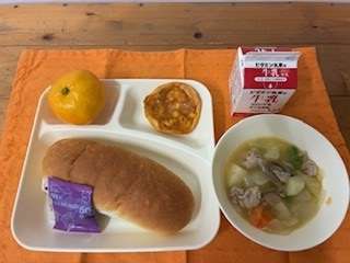 豚肉と野菜のスープ煮、変わりピザ、みかん、コッペパン(ブルーベリージャム)、牛乳