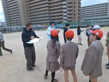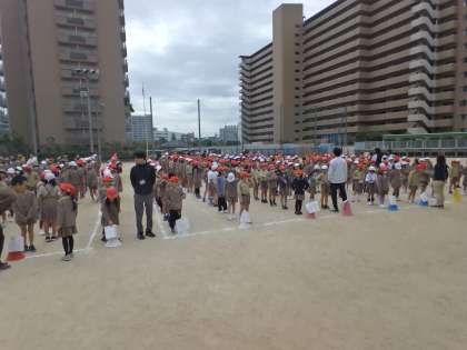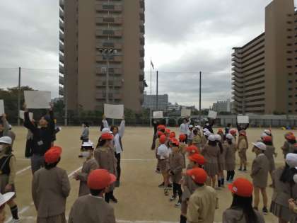学級ごとに1列に並び、先頭から伝言をしていきます。
