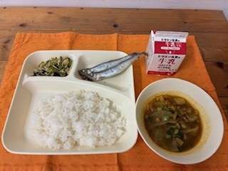焼きししゃも、和風カレー汁、ささみとこまつなのいためもの、ごはん、牛乳