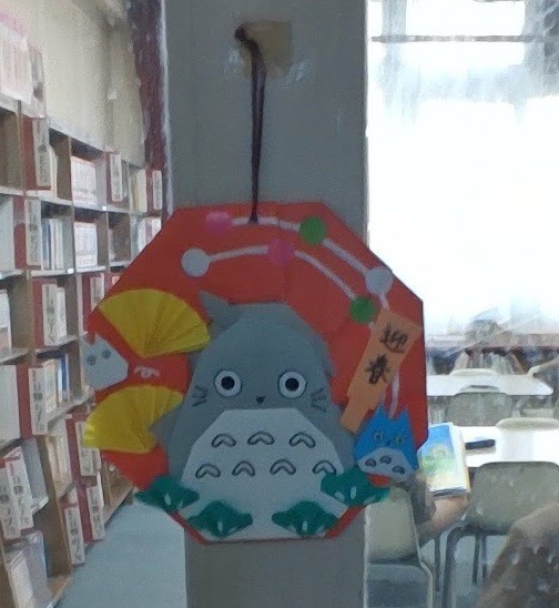 図書館の入り口や中には、かわいい掲示物も増えています。