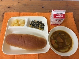 ミートボールと野菜のカレー煮、ツナとほうれんそうのソテー、パインアップル(カット缶)、黒糖パン、牛乳