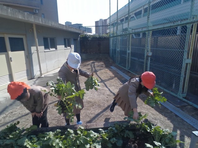 なかよし学級の子どもたちが、学習園でダイコンを育てました。