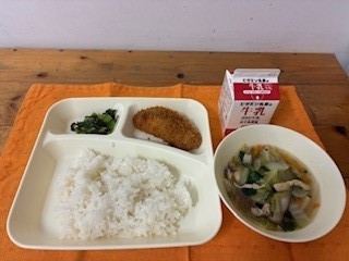 たらフライ、うすくず汁、こまつなのごまあえ、ごはん、牛乳