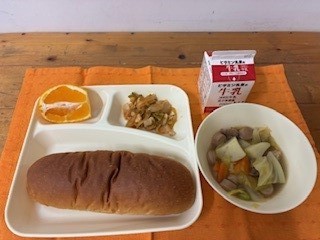 ポトフとは、肉や野菜、香草などを煮こんだフランスの家庭料理の一つです。フランスでは、煮こんだ肉や野菜をスープと別々に盛り付けて食べます。今日の給食のポトフは、牛肉やウインナー、じゃがいも、キャベツ、にんじん、えだまめを使っています。いろいろな具材のうま味が出た煮ものでした。(栄養教諭)