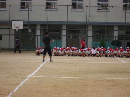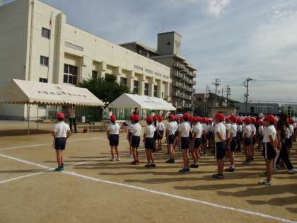 今年の運動会は9月28日です。18日に1回目の全体練習をしました。入場行進をして開会式の隊形に並びました。1年生は初めての入場行進でしたが、戸惑いながらもがんばっていました。