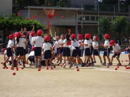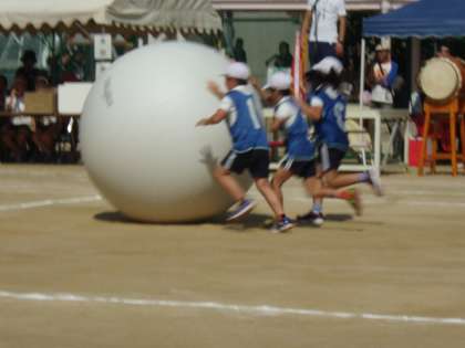 団体競技も紅白の得点では盛り上がりました。1年生は「玉入れです」2年生は自分の身長ほどもある「大玉コロコロ」をしました。