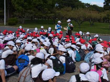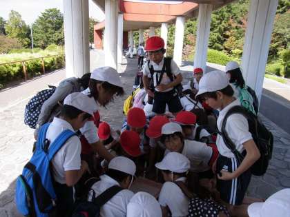 公園までは各学級で移動しましたが、公園に着くと、たてわり班に集まりました。そして、オリエンテーリングに出発です。地図を見ながら班長さんが中心になって、みんなでポイントの場所を探しました。