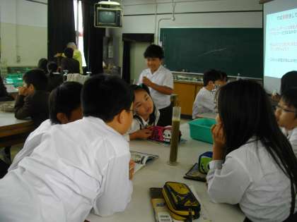 先生が現地に行かれて撮られた映像を、わかりやすい説明とともにたくさん見せていただきました。外国の地形も多く、珍しそうに見いっていました。地層にでき方については、授業の中で、メスシリンダーを使って変化を観察しました。短時間の間に分かれていく様子がわかるので、先生の話がよくわかりました。