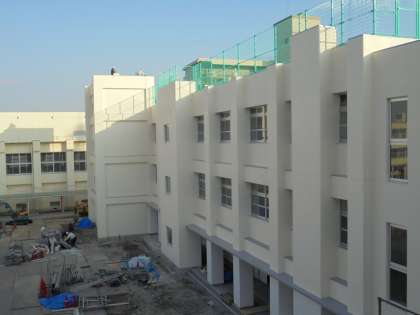 先日、新しい校舎を覆っていた足場などが取り払われて、新校舎が姿を現しました。クリーム色の外壁も初々しく、夕方には真新しい窓ガラスが夕日を照り返してきらきら輝いていました。まだ工事の囲いの中での新校舎を目にしながら、運動場で元気に遊ぶ児童。予定では3月に完成。ここで学習できる日までもう少しのしんぼうです。