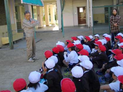 11月13日(木)に、1.2年生がおいもほりをしました。5月22日に地域の方のご指導で植えたものです。この日も地域の方に来ていただいて、一緒においもほりをしました。今年は天候の関係もあって、いつもの年よりつるののびや、葉の茂りが少なく、毎日お世話してくださっている地域の方も「おいもができているかな」と、心配しておられました。お話を聞いて、いよいよいもほりです。