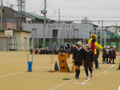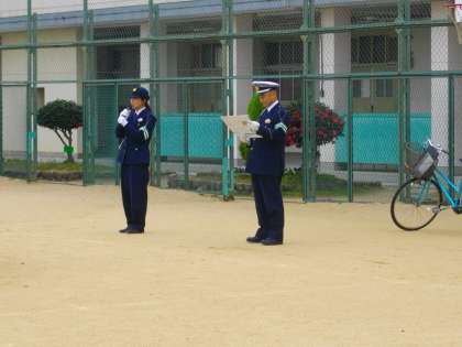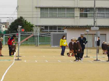 12月12日(金)の2時間目、此花警察や此花区のパトロール隊、交通安全協会の方に来ていただいて、交通安全指導を行いました。低学年は、主に歩き方の学習です。まず、警察の方のお話を聞いたり、お手本を見たりしました。そして、運動場に描かれた道路や道を、横断歩道の渡り方や歩行者の決まりなどを確認しながら歩きました。きめ細かく教えていただいて、しっかりと学習することができました。