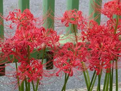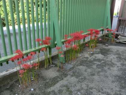 正門横スロープの柵の内側に咲いているヒガンバナが見ごろを迎えています。どんなに夏が暑くても、長雨が降ろうとも必ずこの時期に花を咲かせるヒガンバナの不思議さを毎年感じます。日に日に季節の深まりを感じるこの頃です。
