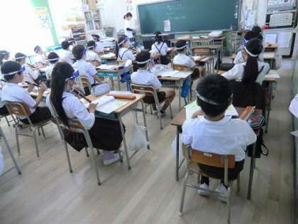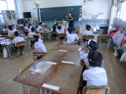 コロナウイルスによる感染予防のため、学習内容によってはフェイスシールドを着用する場面があります。左の写真はリコーダーの練習風景で右は小グループによる話し合い活動を含めた学習場面です。このようにマスクを着用しての学習が難しい場合や対面による飛沫の影響が考えられる場面では、フェイスシールドを活用することがあります。