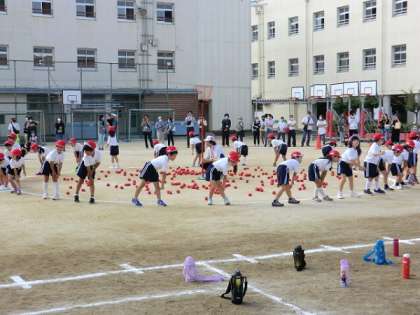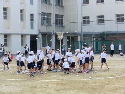 今日は酉島運動しようDayでした。1時間目は1・2年生です。合同で玉入れに取り組みました。また、競技開始前や競技の合間にかわいいダンスも披露しました。