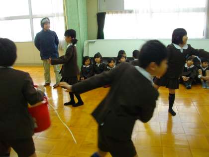 1.2年生は、区役所の方のクイズやお話と、バケツリレーをしました。バケツには水の代わりに土嚢を入れて、少し重いバケツにしましたが、とても楽しそうに取り組んでいました。