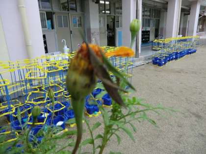 今日校舎を巡回していたときに、珍しい生き物を見つけたので写真に収めました。少しピントがあまいのですが、しおれたマリーゴールドの花の上にバッタがいます。よく見ると枯葉色の大きなバッタの上に小さな緑のバッタが乗っかっています。その姿がおんぶされているように見えることから、「オンブバッタ」という名前が付けられたバッタの仲間です。インターネットで調べてみると大きい方がメスで、小さい方がオスだそうです。