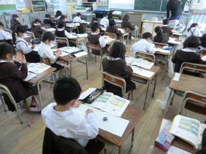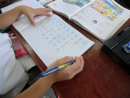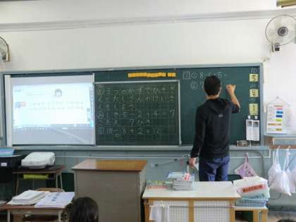1年生が算数の学習で「3つのかずをつかったたしざんとひきざん」の学習に取り組んでいました。3つの数字を使ってひとつの式の中にたし算とひき算が混じっている計算の学習です。1年生の学習内容も少しずつ難しくなってきています。