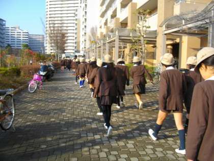 まず、避難訓練をしました。第1次避難は、運動場。第2次避難は、堤防の上に立つ高層住宅街の広場。そして第3次避難は、今年初めて実施する一番高い住宅の階上です。避難階段を使わせていただいて、1年が3階2年が4階・・・6年が9階のフロアまで避難しました。