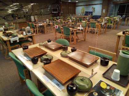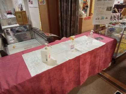 いよいよ夕食です。感染対策として、入口に消毒液があります。また、向かい合った座席の間にはアクリル板が設置されています。