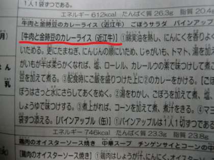 今日の給食のメニューは「牛肉と金時豆のカレーライス」でした。カレーライス自体は珍しいメニューではないのですが、使われているのが国産牛の「近江牛(おうみうし)」のお肉でした。「近江牛」のような高級食材が給食に使わたのは、新型コロナウイルス感染拡大により深刻な影響を受けている、国産農林水産物などの生産者さんを支援するためだそうです。