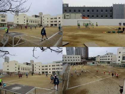 5年生が体育の学習でサッカーに取り組んでいます。工事の関係で半分の広さしかない運動場ですが、密にならないよう工夫しながら学習を進めていました。