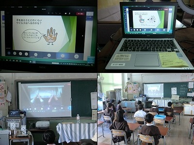今日(2/18)の児童集会は、委員会の発表集会でした。健康委員会が清潔に保つことの大切さについて、発表しました。集会は現在も「Teams」を使ってリモートで行っています。下の段の2枚の写真は、教室でリモートの集会を見ている様子です。
