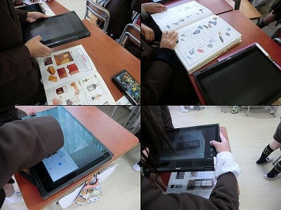 先日3年生が社会科の学習で「昔の道具」の見学をしている様子をお伝えしました。その学習の最後はまとめとして新聞を作ることになっています。今日はそのための資料をタブレット端末を使って集めていました。資料となる本の必要な部分をカメラで撮影し、記事を作成するときに活用します。