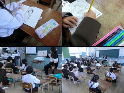 1年生の教室での様子です。待ち時間を利用して自由帳を使って絵を描いたり文字を練習したりしています。プリントに取り組んでいる子どももいました。また、絵本の読み聞かせもしています。学校生活に慣れるごとに、学習も本格的にスタートしていきます。
