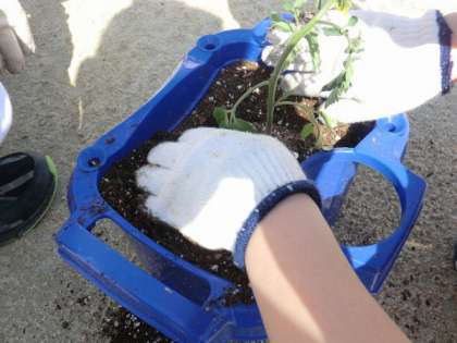 2年生が生活科の学習で、ミニトマトの苗を植木鉢に植え替える学習をしていました。1年生のときは、アサガオとチューリップを育てました。同じ植木鉢を使って、今度はミニトマトを育てます。アサガオは種から、チューリップは球根から育てましたが、ミニトマトは苗から育てます。子どもたちは、これらの学習を通して植物のいろいろな育て方を学びます。ミニトマトのこれからの成長が楽しみですね。