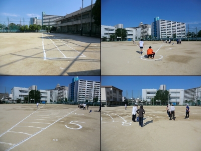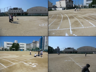明日は此花総合のグランドをお借りして、学年ごとにスポーツテストが行われる予定です。スポーツテストに向けて、放課後に教職員でライン引きなどの準備を行いました。