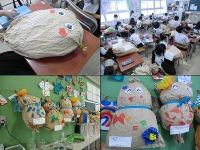 2年生が図工科の「クシャクシャ ギュッ」の作品作りに取り組んでいました。これは、クシャクシャにした大きめの紙袋の中に丸めた新聞紙を詰め込んで、飾りつけをしながら作りたい形に仕上げるというものです。動物や魚、鳥など生き物をモチーフにした作品を作っている子どもが多く見られました。