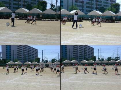 まずは、1年生です。個人走「ようい どん!」と団体演技「HEY! HEY! HEY!」を行いました。
