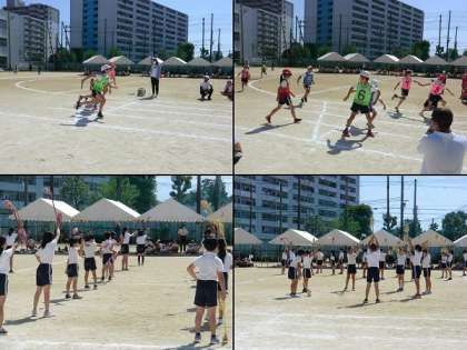 4年生から走競技はリレーになります。リレー競技「つなげ!心とバトン」と団体演技「GONGをならせ」を行いました。