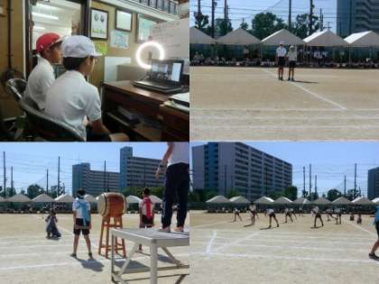 学年以外のことも紹介します。写真の上段は開会式と誓いの言葉の様子です。今年の運動会の開閉会式は、感染対策としてTeamsを使って各学級に配信して行われました。下段は応援団です。応援団も2部制のため5年生と6年生に分かれて、それぞれが応援合戦を行いました。毎日放課後に残って練習した成果を存分に発揮して、大きな声を出さなくても迫力ある応援を披露しました。