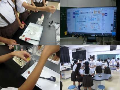 6年生が理科室で、炭酸水に溶けているものを調べる学習をしていました。これまでの学習で分かったことを活用して、石灰水や火のついた線香などで確認をしながら実験を進め、溶けているものの正体を考えていました。