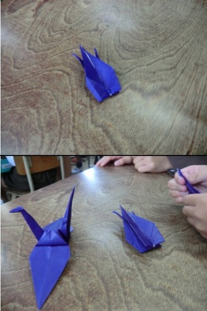 酉島小学校では毎年6年生が修学旅行で平和記念公園に折り鶴を納めています。納める折り鶴は、全校児童が平和への願いを込めて折ったものです。1年生は今年初めて折り鶴作りに参加します。本日6年生が1年生の教室に出向いて、鶴の折り方を教える交流を行いました。6年生の子どもたちは、ペアになった1年生に優しくていねいに折り方を教えていました。