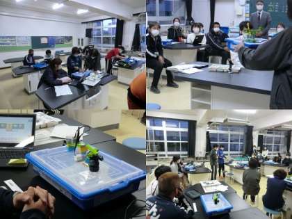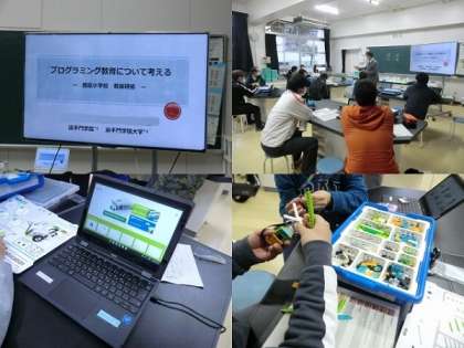 放課後に追手門学院の先生方にお越しいただいて、プログラミング教育についての研修会を行いました。プログラミング教育の意味や取り組み方についての講義を受けたり、ワークショップでプログラミング教材を活用した課題解決学習に取り組んだりしました。