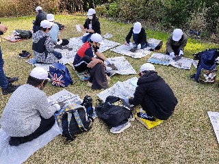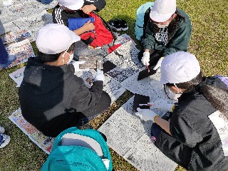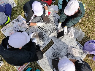 お昼ご飯の後の活動は、焼き板磨きです。歯ブラシなどを使って板の表面に付いた炭を落としながら磨きます。