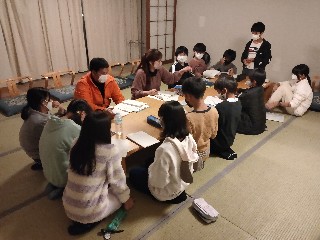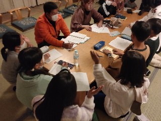 楽しかったキャンプファイヤーの後は、リーダー会議です。この後、各部屋で振り返りを行い、就寝準備をして1日目が終了します。
