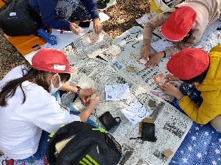 舞洲では、最後の活動となる勾玉作りをしています。四角い石を思い思いの形に削っています。