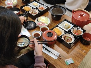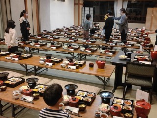 夕食の風景です。これも感染対策として、全員が同じ方向ん向いて食べるように配膳されていました。