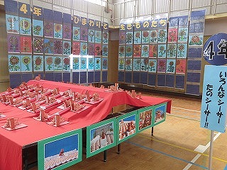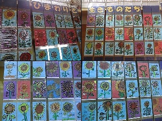4年生の様子です。平面は「ひまわりと生きものたち」、立体は「いろんなシーサー、たのしーサー」というタイトルの作品を展示しました。