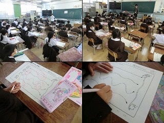 小学校生活2日目の1年生です。現在の1年生は学校生活のきまりなどを覚えることが中心になりますが、学習も始めています。2時間目にプリントを使っていろいろな線を鉛筆でなぞる学習に取り組んでいました。