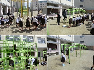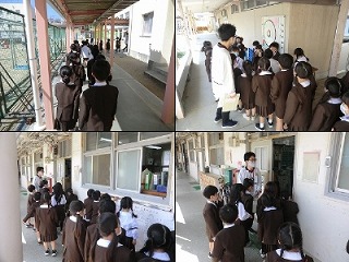 本日2時間目と3時間目に1年生が「がっこうたんけん」をしました。校舎内を回りながら、いろいろな教室の場所と名前を確認していました。がっこうたんけんはクラスごとに行われ、たんけんをしていない学級は運動場で遊具の使い方について学習しました。1年生のみんなは、少しずつですが学校生活に慣れていっています。