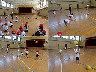 1年生が体育館で体育の学習に取り組んでいました。カエルジャンプで輪っかの中に置かれたボールまで行き、ボールを投げてキャッチする動作をした後、三角コーンを回ってゴールをする運動にチャレンジしていました。