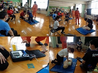 もうすぐ始まるプール水泳の学習や暑くなるとともに心配される熱中症に備え、放課後に教職員を対象に救命救急研修会を実施しました。万が一の場合、命に係わる大切な研修です。此花消防署の方々の指導を受けながら、全員がしんけんに取り組んでいました。