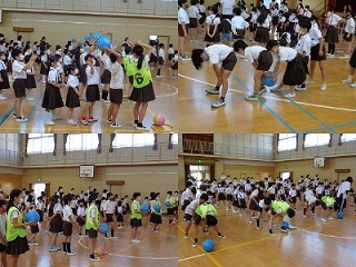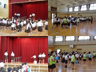 児童集会がありました。班を分けて講堂で行う集会も2巡目になります。今日の集会は新しいゲームをしました。たてわり班で1列に並び、ボールを先頭から後ろの人に送り、最後尾まで行くと先頭に戻し、早く戻した班の勝利というゲームです。最初は頭の上からパスをし、戻すときは足の間を通すというルールでした。ゲームは2回行われ、2回目は1回目と逆の手順でボールを送っていました。